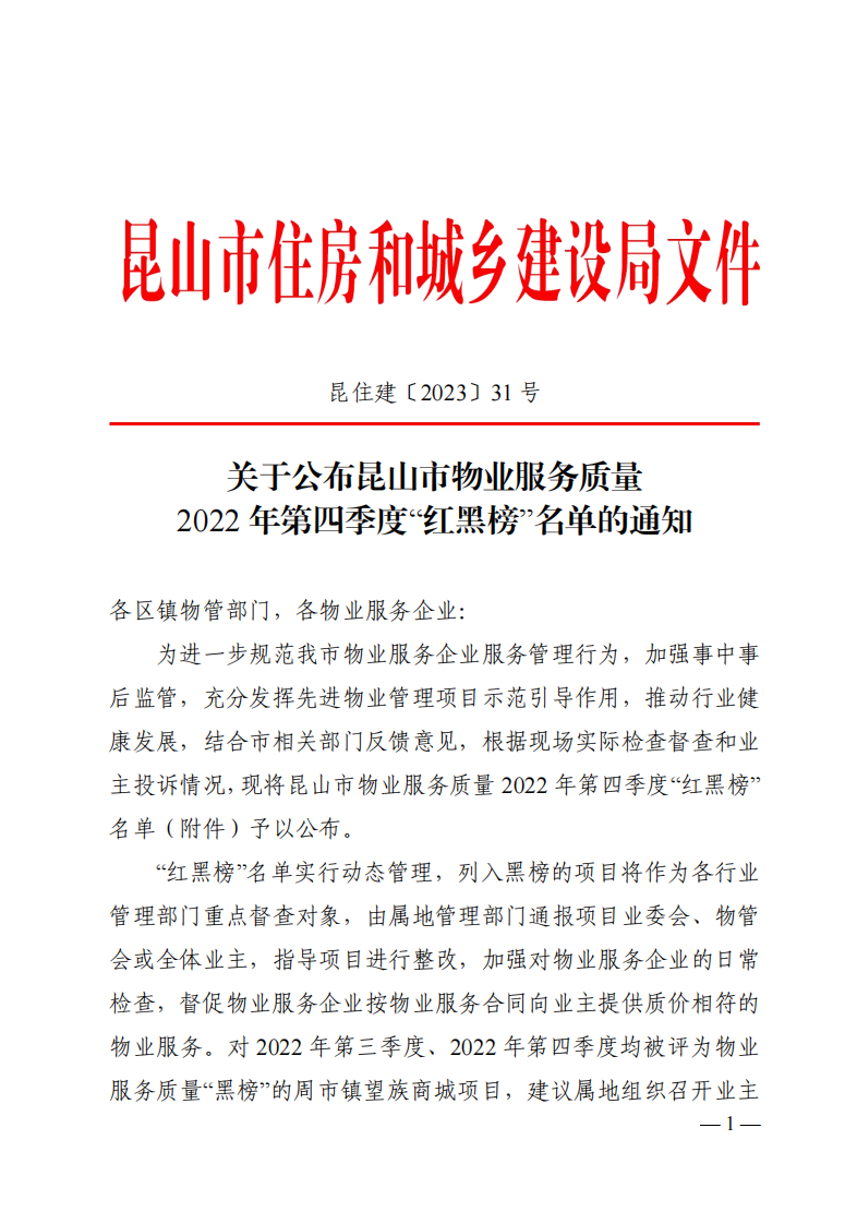 关于公布昆山市物业服务质量 2022年第四季度“红黑榜”名单的通知