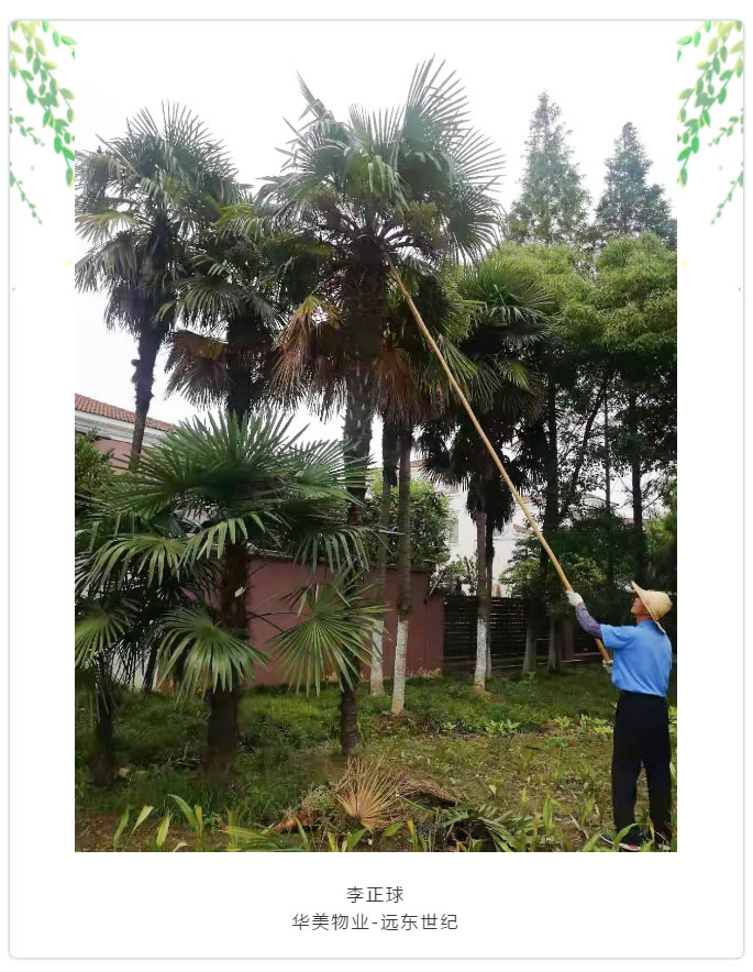 华美物业公司李正球同志是远东世纪园小区的一名绿化工,从事绿化工作多年,他一直兢兢业业,任劳任怨,是一名有着多年工作经验的老绿化工。在日常的绿化修剪工作中,为公司在业主面前赢得了信誉,获得了业主和同事的一致好评。
