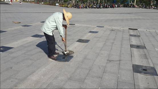 烈日炎炎,保洁师傅广场清扫作业