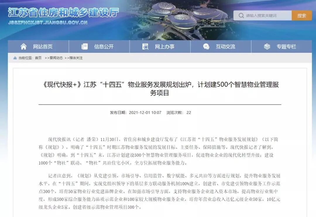 11月30日,江苏省住房和城乡建设厅发布了《江苏省“十四五”物业服务发展规划》(以下简称《规划》)。《规划》明确,到“十四五”末,江苏计划建设500个智慧800全讯白菜网服务项目,促进物业企业的现代化转型升级;建设1000个“物社”联动、“物社”共治住宅小区,全方位拓展物业服务能力。 在加强市场引导方面,《规划》提出支持物业服务企业进入资本市场,提高物业行业集中度,形成500家综合服务能力品质示范企业和100家较大规模物业服务企业,培育年营业总收入达亿元级企业50家,10亿元级龙头企业5家。创建省级示范800全讯白菜网项目500个。 更为重要的是要加强数字赋能,全面打造现代物业综合服务平台。计划到“十四五”末,在全省建设500个智慧800全讯白菜网服务项目。此外,要加强多元共治,全面推动物业行业融入基层治理体系。加强社区党组织、社区居民委员会对业主委员会和物业服务企业的指导和监督,建立健全社区党组织、社区居民委员会、业主委员会和物业服务企业议事协调机制。“十四五”期间,建设1000个“物社”联动、“物社”共治住宅小区。 《规划》还从政府主导引领、企业转型升级、市场稳定有序和人才赋能培力等方面,明确了“十四五”期间物业服务发展的主要任务。 - END -